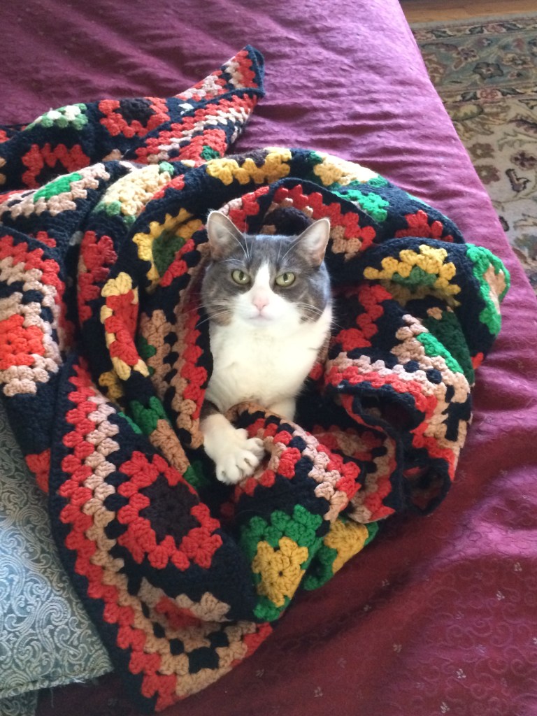 It was the end of all of that, all of it bundled into a tiny, scruffy gray cat. We see her ghost on our bed a few times a day now. I’ve put away the hoody that most looks like her. We did a little memorial yesterday, where we looked at the hundreds of photos of her that we’d taken.