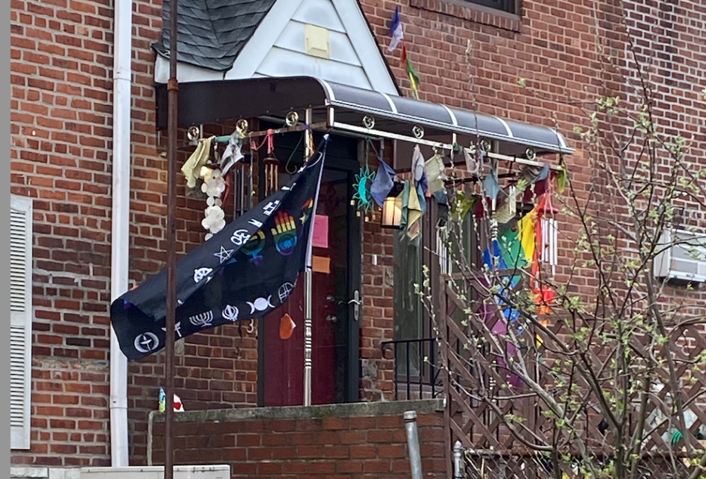 But no active torture. Just very Loud Wind Chimes that blow about, and 2 giant flags, one on either side of her front stairs. Their flapping demonstrates that she loves gay people and Jews and Black people and probably all the other groups. I try not to stare at her stoop because of the floodlight camera trained on my own (flag free) front stoop so I haven’t parsed the whole range of flag meanings. But clearly she is really an ally of anyone, anywhere. Except the chumps next door.