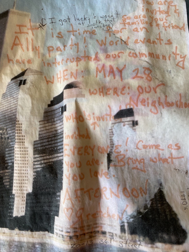 [the image is the Twin Towers, I think, and there are 2 other notes written in pen. The top note has an X on one of the buildings and the copy is: I got lucky & wasn’t at work that Tuesday ):